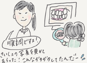 治療に向けて私のむし歯のリスクのお話を聞きました。むし歯の成り立ちや私のための予防プログラムを勉強しました!今まで考えたこともなかったな・・・